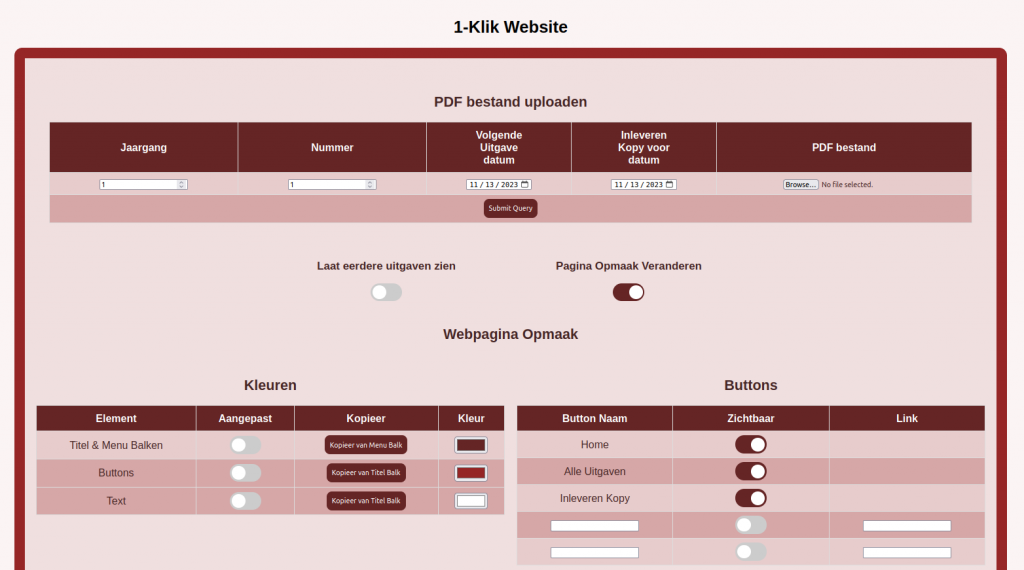 Hoewel u voor uw 1-Klik Website niets hoeft te programmeren en u zich ook niet met andere technische zaken hoeft bezig te houden, zijn er toch een (beperkt) aantal zaken die u zelf kunt instellen indien gewenst. Zo kunnen de kleuren van de titel- en menu-balk, de buttons in de menu-balk en de teksten zelf gekozen worden. Ook is het mogelijk om buttons weg te halen of om (maximaal twee) extra buttons toe te voegen.