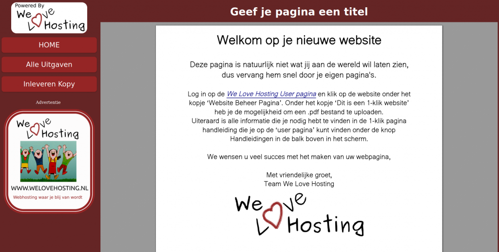 Hieronder ziet u een voorbeeld van de standaard pagina zoals die er uit ziet als u uw website heeft aangemaakt. Daaronder ziet u twee afbeeldingen met hoe het controlepaneel van uw 1-Klik Website er uit ziet in de beheer pagina. Wilt u liever eerst een keer op een 1-Klik pagina kijken? Klik dan op onze Voorbeeld 1-Klik Website of Klik Hier voor de Handleiding